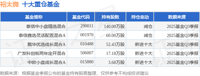 根据2025基金Q3季报公募基金重仓股数据,重仓该股的公募基金共5家,其中持有数量最多的公募基金为泰信基金的泰信中小盘精选混合。泰信中小盘精选混合目前规模为17.22亿元,最新净值5.448(1月15日),较上一交易日上涨0.17%,近一年上涨61.81%。该公募基金现任基金经理为董季周。董季周在任的基金产品包括:泰信鑫选灵活配置混合A,管理时间为2020年11月24日至今,期间收益率为39.19%。